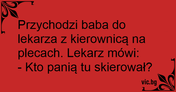 Przychodzi baba do lekarza z kierownicą na plecach. Lekarz mówi: