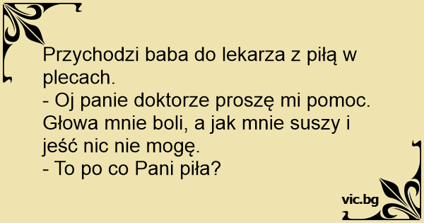 Przychodzi baba do lekarza z piłą w plecach.
