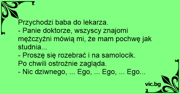 - Panie doktorze, wszyscy znajomi mężczyźni mówią mi, że mam pochwę jak studnia...