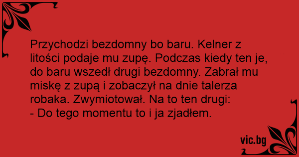Przychodzi bezdomny bo baru. Kelner z litości podaje mu zupę. Podczas kiedy ten je, do baru wszedł drugi bezdomny. Zabrał mu miskę z zupą i zobaczył na dnie talerza robaka. Zwymiotował. Na to ten drugi: