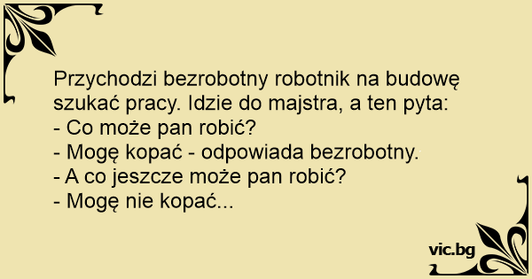 Przychodzi bezrobotny robotnik na budowę szukać pracy. Idzie do majstra, a ten pyta: