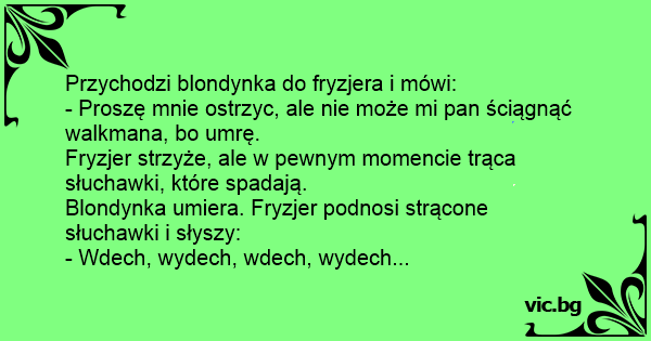 Blondynka przyszła do fryzjera ze słuchawkami na uszach. Pod żadnym pozorem nie pozwalała w czasie strzyżenia ściągnąć sobie słuchawek. Jednak fryzjer niechcący zahaczył o słuchawki i te spadły na...