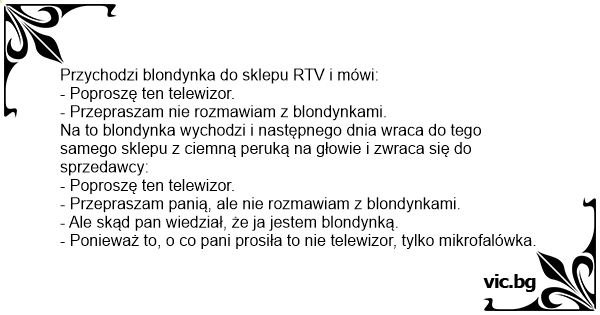 Blonde at the Appliance Store An Blondinen verkaufen wir nichts Αγορά "τηλεόρασης".. Όσο και να βάφεσαι, ξανθιά παραμένεις Δεν πουλάμε σε ξανθιές Μια ξανθιά σε κατάστημα ηλεκτρικών Блондинка отишла в Технополис, харесала си телевизор и поискала да го купи. Блондинка влиза в магазин за електро уреди. Пита продавача: Geht eine Blondine in einen Elektroladen und sagt: Une blonde désire acheter une télé. Elle appelle le vendeur: Kommt eine Blondine in das Elektrogeschäft: Eine Blondine kommt in ein Elektrogeschäft und sagt: A blonde walked into an electronics store and said to the salesmen: "I want that tv." A blonde goes into a nearby store and asks a clerk if she can buy the TV in the corner. The clerk looks at her and says that he doesn't serve blondes, so she goes back home and dyes her hair black. The next day she returns to the store and asks the same thing, and again, the clerk said he doesn't... Przychodzi blondynka do sklepu AGD i pyta sprzedawcę: - Proszę pana, po ile ten telewizor? - Blondynkom nie sprzedajemy. Zdenerwowana blondynka wychodzi ze sklepu. Następnego dnia przychodzi do sklepu i pyta ponownie: - Proszę pana, po ile ten telewizor? - Blondynkom nie sprzedajemy. Blondynka... En blondin går in i en affär och frågar en säljare om hon kan få köpa den där teveapparaten i hörnet. Säljaren tittar på henne och säger att han säljer inte till blondiner, så hon går tillbaka hem och färgar sitt hår svart. Nästa dag går hon tillbaks... A blonde went to the eletronic store and she asked, "How is much is this TV?" The salesman said, "Sorry, we don"t sell to blondes." The next day she came back as a brunette. She asked the... Er gaat een dom blondje naar de Elektrozaak. Op een gegeven moment vraagt ze aan de verkoper: "Ik wil graag dat televisietoestel kopen." Zegt de verkoper: "Ik verkoop niet aan domme blondjes. Het... Genc ve guzel sarisin, alisveris merkezinin beyaz esya reyonuna girer ve saticiya sorar: - "Su kucuk televizyonu almayi dusunuyorum, fiyati nedir ?" - "Kusura bakmayin hanimefendi sarisinlara... Kommt eine Blondine in ein Elektrogeschäft. Sagt sie: Ich hätte bitte gern den Fernseher dort drüben. Sagt der Verkäufer: Tut mir leid, an Blondinen verkaufen wir nicht. Die Blondine färbt sich die... A loira foi até a loja de eletrodomésticos para comprar um aparelho de TV. Chegando lá, falou para o vendedor: — Moço, eu quero aquele aparelho de TV que está ali. Quanto ele custa? — falou ela... A loira chega numa loja e procura um vendedor e diz: gostaria de comprar essa tv !!! o vendedor diz: não vendemos tvs para loiras !!!! a loira revoltada vai embora passa na farmacia e compra... Een dom blondje komt de elektronicawinkel binnenlopen en vraagt aan de verkoper “Mag ik die TV kopen?” Waarop de verkoper antwoordt “Wij verkopen niet aan domme blondjes” Paar dagen later komt... Det var en gång en blondin som gick till affären. Hon sa: - Jag vill ha den där datorn, och pekade på den. Expedition svarade: - Tyvärr, vi säljer inte till blondiner... Nästa dag gick blondinen... Había una vez un atlante que va a una tienda, y pregunta: ¿Cuánto cuesta ese televisor? 200 pesos, ¿es usted atlante?, pregunta el vendedor. A lo que el atlante dice: ¿Por qué? Por nada, responde... um loira foi em uma loja de eletro domésticos e falou:quero compra aquela TV e o vendedor disse nós não vendemos produtos para loiras. Ela foi em casa e pintou o cabelo de preto e voltou na... Uma moça bonita, loira e alta, entrou em uma loja de eletrodomésticos e perguntou ao vendedor: - Quanto é aquela tv ali? E o moço respondeu: - Não vendemos para loiras!!!! A moça, sem entender... One day, a blonde goes into a store. She gets an item and walks up to the cashier. She says,"I'd like to buy this TV". He says,"Sorry, we don't sell to blondes". The next day, she dyes her hair red... Een dom blondje komt een winkel binnen en zegt: “Meneer, mag ik die tv kopen die daar staat?” De verkoper antwoordt: “Nee, ik verkoop niks aan domme blondjes.” De volgende dag komt hetzelfde domme... En blondin går in i en elektronikaffär och säger till expiditen: -Jag vill ha den där teven och pekar med fingret. - Tyvärr, vi säljer inte till blondiner, sa expiditen. Blondinen gick iväg och... Det var en gang en blondine, hun gikk til en butikk og spurte kjøpmannen: – Kan jeg kjøpe den vaske maskinen? – Nei, jeg selger den ikke til blondiner. sa kjøpmannen. Da tok hun på seg en brun... Blondine im Elektroladen Eine Blondine geht in einen Elektroladen. Nach kurzer Zeit sagt sie zu dem Verkäufer: „Ich hätte gern den Fernseher dort oben!“ Der Verkäufer verneint: „Tut mir leid, ich... A blonde walks into a electronic store and asks the manager, “Can I buy that TV” “No” “Why not?” “Because your a blonde.” So the blonde goes out and dyes her hair red. She returned to the... Een dom blondje stapt een elektro zaak binnen en vraagt: “Hoeveel kost die tv?” De man van de winkel zegt: “Sorry mevrouw wij verkopen niet aan domme blondjes.” Het domme blondje keert terug naar... Πάει μια ξανθία σε ένα μαγαζί και λέει: << Πόσο κάνει αυτή η τηλεόραση;>> Και ο καταστηματάρχης: <<Κυρία μου δεν πουλάμε πράγματα σε ξανθιές>> Πάει την επόμενη φορά η ξανθία... Blondinen går till affären och vill köpa en tv. - Jag vill köpa den där! säger hon och pekar. - Hihi. Vi säljer inte till blondiner. Blondinen blir ledsen och går hem och färgar håret blått. Hon... Uma loira foi numa loja de eletromésticos e perguntou para o homem que trabalhava lá quanto custava essa Tv. O homem disse que não vendia
