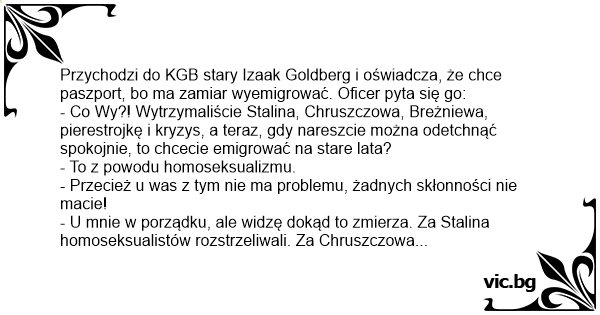Przychodzi do KGB stary Izaak Goldberg i oświadcza, że chce paszport, bo ma zamiar wyemigrować. Oficer pyta się go: