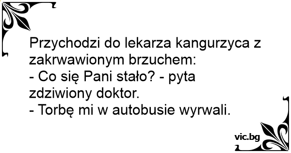 Przychodzi do lekarza kangurzyca z zakrwawionym brzuchem: