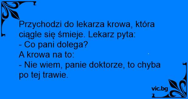 Przychodzi do lekarza krowa, która ciągle się śmieje. Lekarz pyta: