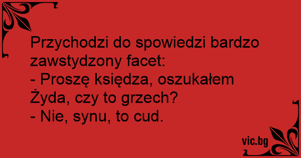 Поляк приходить в костел на сповідь і каже священику: - Пан ксьондз, я згрішив. - У чому полягає гріх, сину мій? - Я обдурив єврея ... Ксьондз після короткого роздуму: - Це не гріх, сину мій. Це диво!