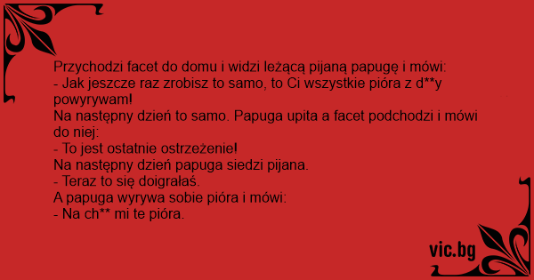Przychodzi facet do domu i widzi leżącą pijaną papugę i mówi: