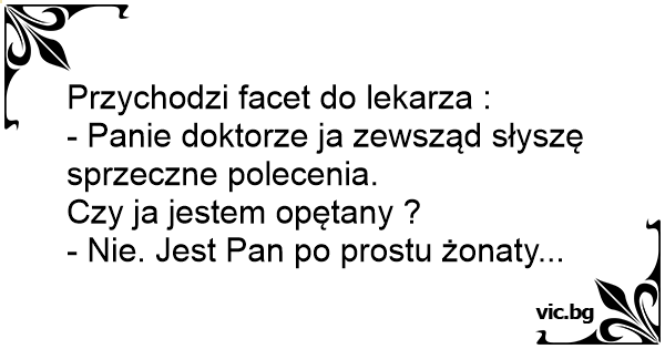 Przychodzi facet do lekarza :<br />- Panie doktorze ja zewsząd słyszę sprzeczne polecenia.<br />Czy ja jestem opętany ?<br />- Nie. Jest Pan po prostu żonaty...
