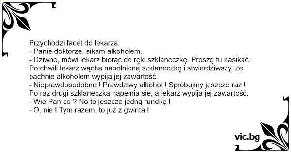 - Dziwne, mówi lekarz biorąc do ręki szklaneczkę. Proszę tu nasikać.