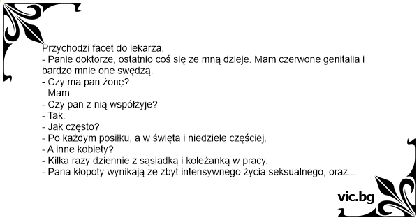 - Panie doktorze, ostatnio coś się ze mną dzieje. Mam czerwone genitalia i bardzo mnie one swędzą.