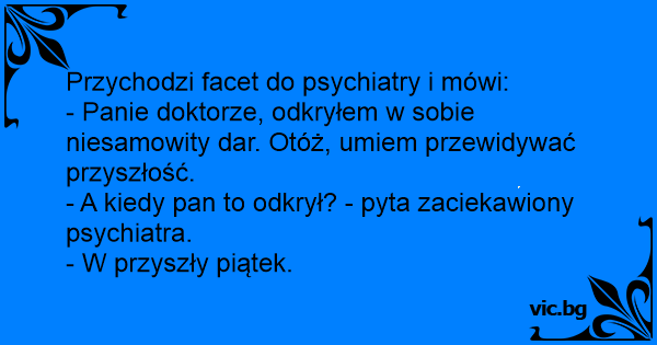 - Panie doktorze, odkryłem w sobie niesamowity dar. Otóż, umiem przewidywać przyszłość.