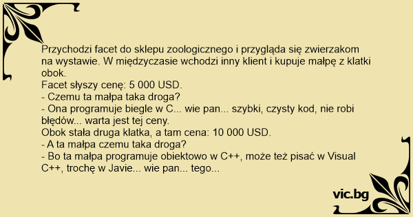 - Bo ta małpa programuje obiektowo w C++, może też pisać w Visual C++, trochę w Javie... wie pan... tego typu. Bardzo przystępna cena.