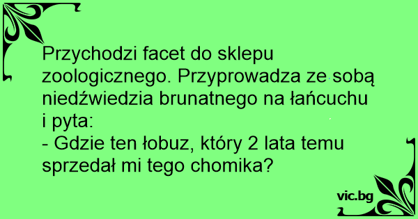 Przychodzi facet do sklepu zoologicznego. Przyprowadza ze sobą niedźwiedzia brunatnego na łańcuchu i pyta: