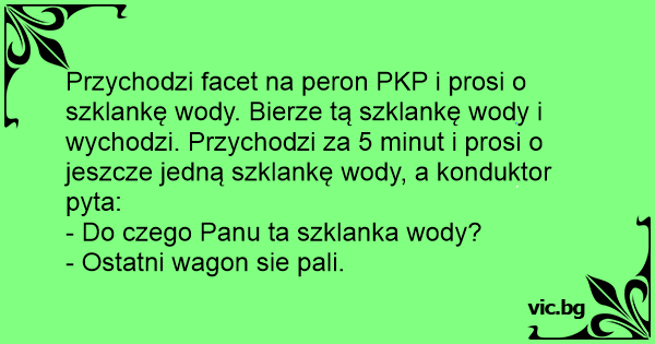 Przychodzi facet na peron PKP i prosi o szklankę wody. Bierze tą szklankę wody i wychodzi. Przychodzi za 5 minut i prosi o jeszcze jedną szklankę wody, a konduktor pyta: