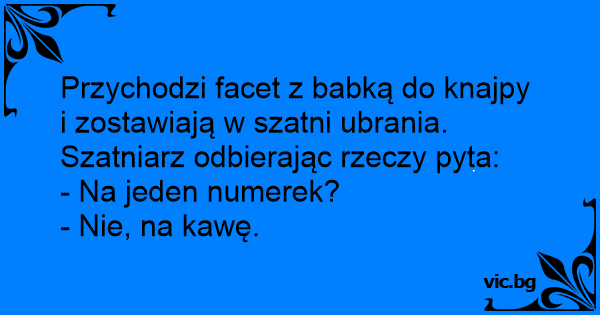 Przychodzi facet z babką do knajpy i zostawiają w szatni ubrania. Szatniarz odbierając rzeczy pyta: