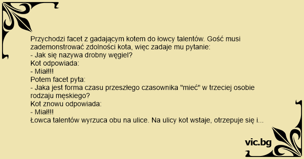 Przychodzi facet z gadającym kotem do łowcy talentów. Gość musi zademonstrować zdolności kota, więc zadaje mu pytanie: