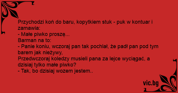Przychodzi koń do baru, kopytkiem stuk - puk w kontuar i zamawia:
