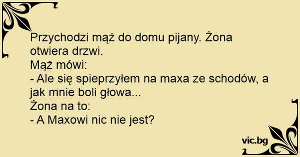 Przychodzi mąż do domu pijany. Żona otwiera drzwi.