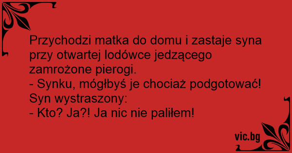 Przychodzi matka do domu i zastaje syna przy otwartej lodówce jedzącego zamrożone pierogi.