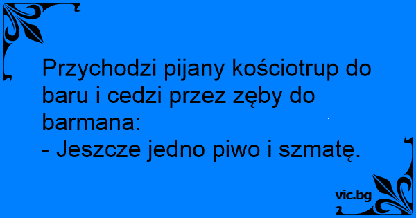Przychodzi pijany kościotrup do baru i cedzi przez zęby do barmana: