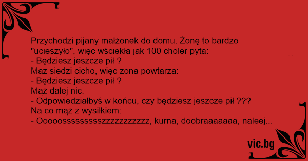 Przychodzi pijany małżonek do domu. Żonę to bardzo "ucieszyło", więc wściekła jak 100 choler pyta: