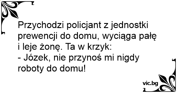 Przychodzi policjant z jednostki prewencji do domu, wyciąga pałę i leje żonę. Ta w krzyk: