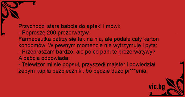 - Telewizor mi sie popsuł, przyszedł majster i powiedział żebym kupiła bezpieczniki, bo będzie dużo pi***enia.