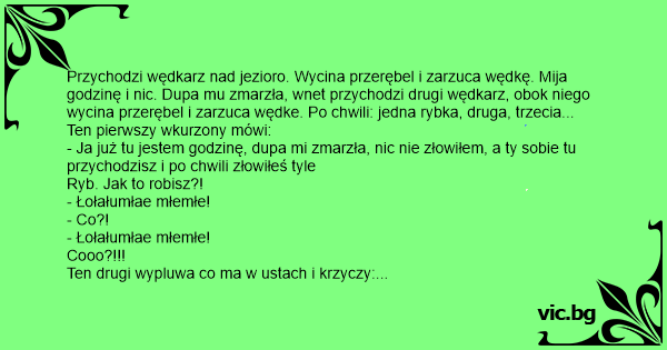 - Ja już tu jestem godzinę, dupa mi zmarzła, nic nie złowiłem, a ty sobie tu przychodzisz i po chwili złowiłeś tyle