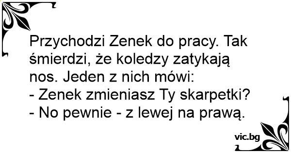 Przychodzi Zenek do pracy. Tak śmierdzi, że koledzy zatykają nos. Jeden z nich mówi: