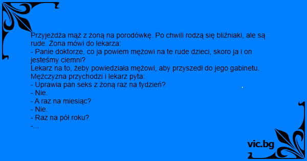 Przyjeżdża mąż z żoną na porodówkę. Po chwili rodzą się bliźniaki, ale są rude. Żona mówi do lekarza: - Panie doktorze, co ja powiem mężowi na te rude dzieci, skoro ja i on jesteśmy ciemni? Lekarz na to, żeby powiedziała mężowi, aby przyszedł do jego gabinetu. Mężczyzna przychodzi i lekarz pyta: - Uprawia pan sекs z żoną raz na tydzień? - Nie. - A raz na miesiąc? - Nie. - Raz na pół roku? - Tak. - To widzisz Pan, coś tym zardzewiałym sprzętem narobił...