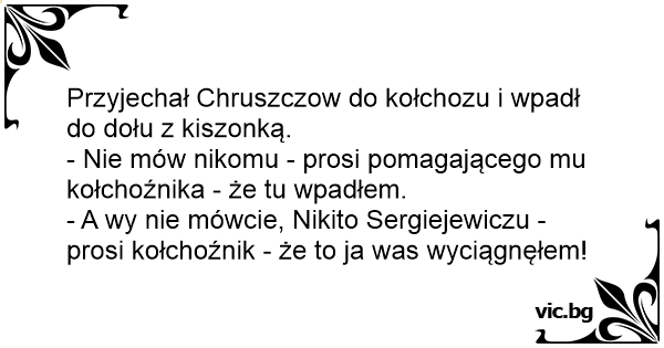 - A wy nie mówcie, Nikito Sergiejewiczu - prosi kołchoźnik - że to ja was wyciągnęłem!