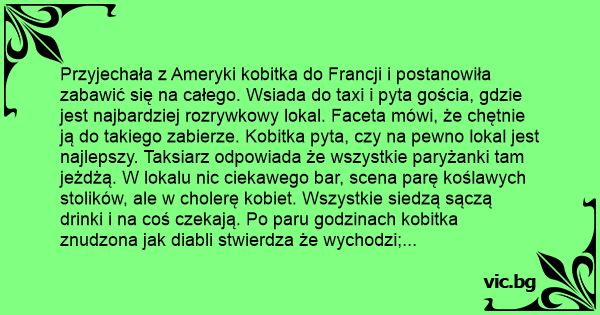 Przyjechała z Ameryki kobitka do Francji i postanowiła zabawić się na całego. Wsiada do taxi i pyta gościa, gdzie jest najbardziej rozrywkowy lokal. Faceta mówi, że chętnie ją do takiego zabierze. Kobitka pyta, czy na pewno lokal jest najlepszy. Taksiarz odpowiada że wszystkie paryżanki tam jeżdżą. W lokalu nic ciekawego bar, scena parę koślawych stolików, ale w cholerę kobiet. Wszystkie siedzą sączą drinki i na coś czekają. Po paru godzinach kobitka znudzona jak diabli stwierdza że wychodzi; ale w tym momencie wychodzi na scenę prezenter i zapowiada numer który wykona Pepee. Wszystkie babki w klubie zrywają się na równe nogi i lecą pod scenę. Zaciekawiona kobitka też tam podchodzi; na scenę wychodzi facio chudy, z podkrążonymi oczami z krzesełkiem w ręku; rozlegają się oklaski i w ogóle jest głośno. Kobitka patrzy ponuro. Facio stawia krzesełko, wyciąga z kieszeni orzech włoski i kładzie go na krześle, następnie wyciąga ze spodni fiuta; przymierza się nim do orzecha i wali w niego cisem karate. Orzech rozpryskuje się na drobne kawałki kobita jest zafascynowana. Wraca do domu i opowiada o tym wszystkim znajomym.