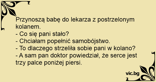 Przynoszą babę do lekarza z postrzelonym kolanem.