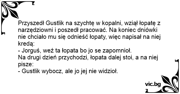 Przyszedł Gustlik na szychtę w kopalni, wziął łopatę z narzędziowni i poszedł pracować. Na koniec dniówki nie chciało mu się odnieść łopaty, więc napisał na niej kredą: