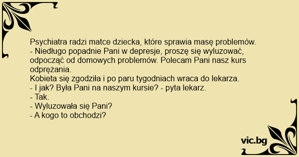- Niedługo popadnie Pani w depresje, proszę się wyluzować, odpocząć od domowych problemów. Polecam Pani nasz kurs odprężania.