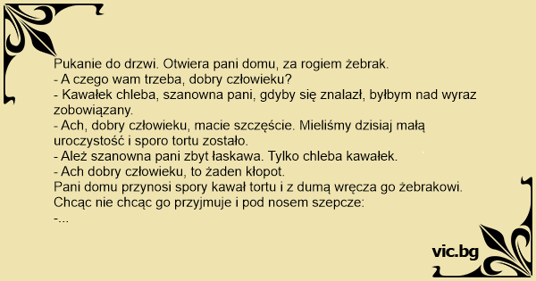 Pani domu przynosi spory kawał tortu i z dumą wręcza go żebrakowi. Chcąc nie chcąc go przyjmuje i pod nosem szepcze: