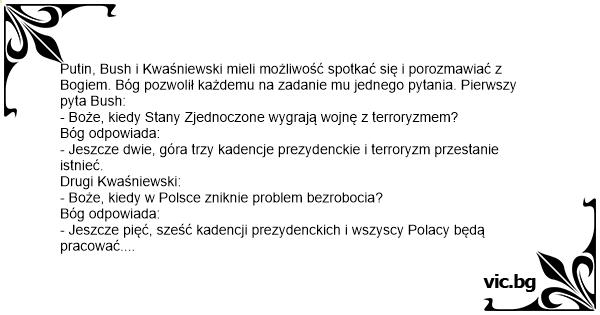 Putin, Bush i Kwaśniewski mieli możliwość spotkać się i porozmawiać z Bogiem. Bóg pozwolił każdemu na zadanie mu jednego pytania. Pierwszy pyta Bush: