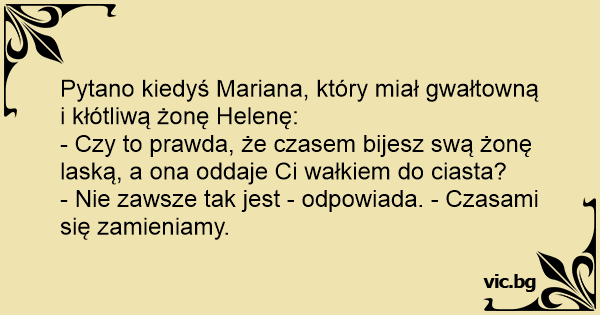 - Czy to prawda, że czasem bijesz swą żonę laską, a ona oddaje Ci wałkiem do ciasta?