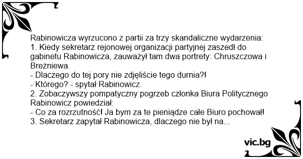 1. Kiedy sekretarz rejonowej organizacji partyjnej zaszedł do gabinetu Rabinowicza, zauważył tam dwa portrety: Chruszczowa i Breżniewa.