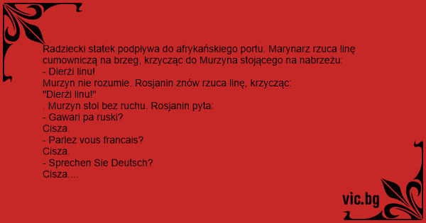 Руски кораб акостира на американско пристанище. Руският моряк подава въжето на американския си колега от брега. - Ей, бери верёвку! Американецът повдигнал неразбиращо рамене. - Do you speak...