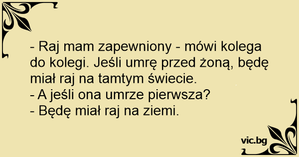 - Raj mam zapewniony - mówi kolega do kolegi. Jeśli umrę przed żoną, będę miał raj na tamtym świecie.