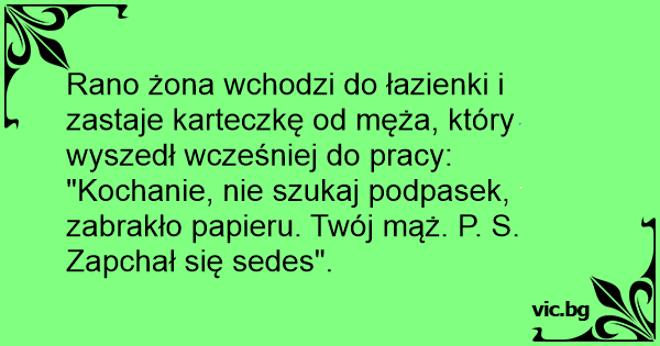 "Kochanie, nie szukaj podpasek, zabrakło papieru. Twój mąż. P. S. Zapchał się sedes".