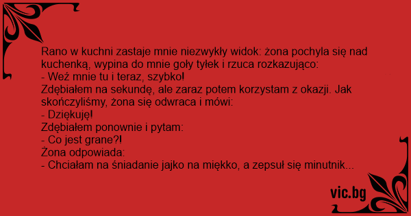 Rano w kuchni zastaje mnie niezwykły widok: żona pochyla się nаd kuchenką, wypina do mnie goły tyłek i rzuca rozkazująco: