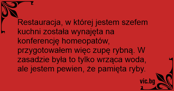 Restauracja, w której jestem szefem kuchni została wynajęta na konferencję homeopatów, przygotowałem więc zupę rybną. W zasadzie była to tylko wrząca woda, ale jestem pewien, że pamięta ryby.