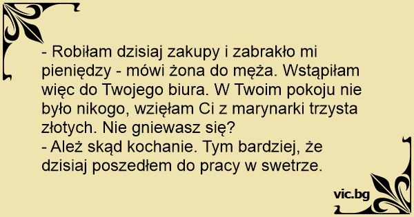 - Robiłam dzisiaj zakupy i zabrakło mi pieniędzy - mówi żona do męża. Wstąpiłam więc do Twojego biura. W Twoim pokoju nie było nikogo, wzięłam Ci z marynarki trzysta złotych. Nie gniewasz się? - Ależ skąd kochanie. Tym bardziej, że dzisiaj poszedłem do pracy w swetrze.