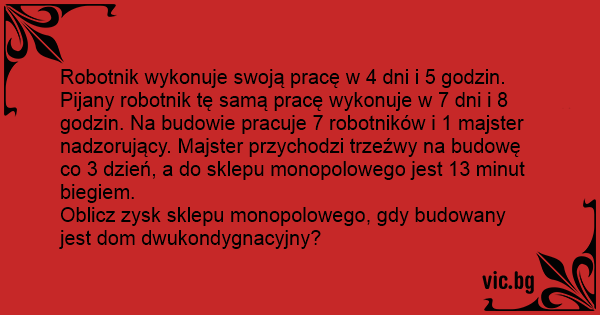 Robotnik wykonuje swoją pracę w 4 dni i 5 godzin. Pijany robotnik tę samą pracę wykonuje w 7 dni i 8 godzin. Na budowie pracuje 7 robotników i 1 majster nadzorujący. Majster przychodzi trzeźwy na budowę co 3 dzień, a do sklepu monopolowego jest 13 minut biegiem.