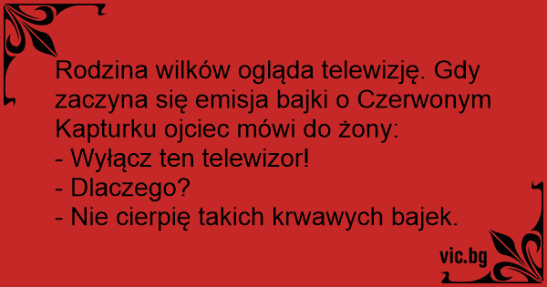Rodzina wilków ogląda telewizję. Gdy zaczyna się emisja bajki o Czerwonym Kapturku ojciec mówi do żony: