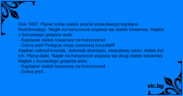 Kapitan założył koszulę, dokonali abordażu, straszliwej rzezi i statek był ich. Płyną dalej. Nagle na horyzoncie pojawia się drugi statek towarowy.