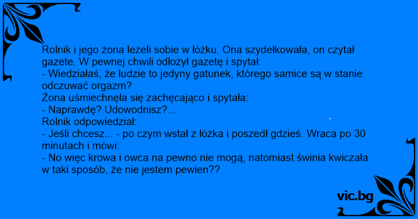 Rolnik i jego żona leżeli sobie w łóżku. Ona szydełkowała, on czytał gazete. W pewnej chwili odłożył gazetę i spytał: